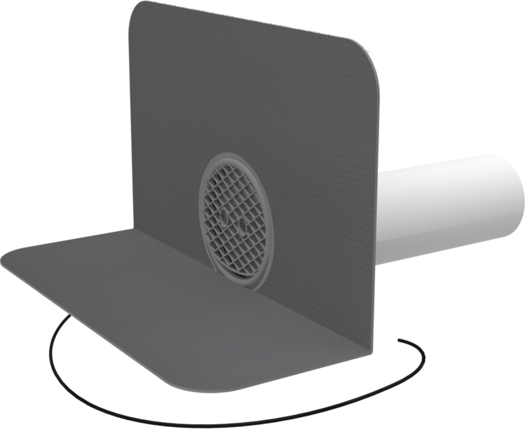 TOPWET round through wall outlet with an integrated custom made sleeve (EPDM, TPO, FPO, PR, STE - suitable for cold liquid applied applications) and with a leaf guard, heated with 230 V with a supply cable. Length 600 mm, option of extension up to 1500 mm on request.